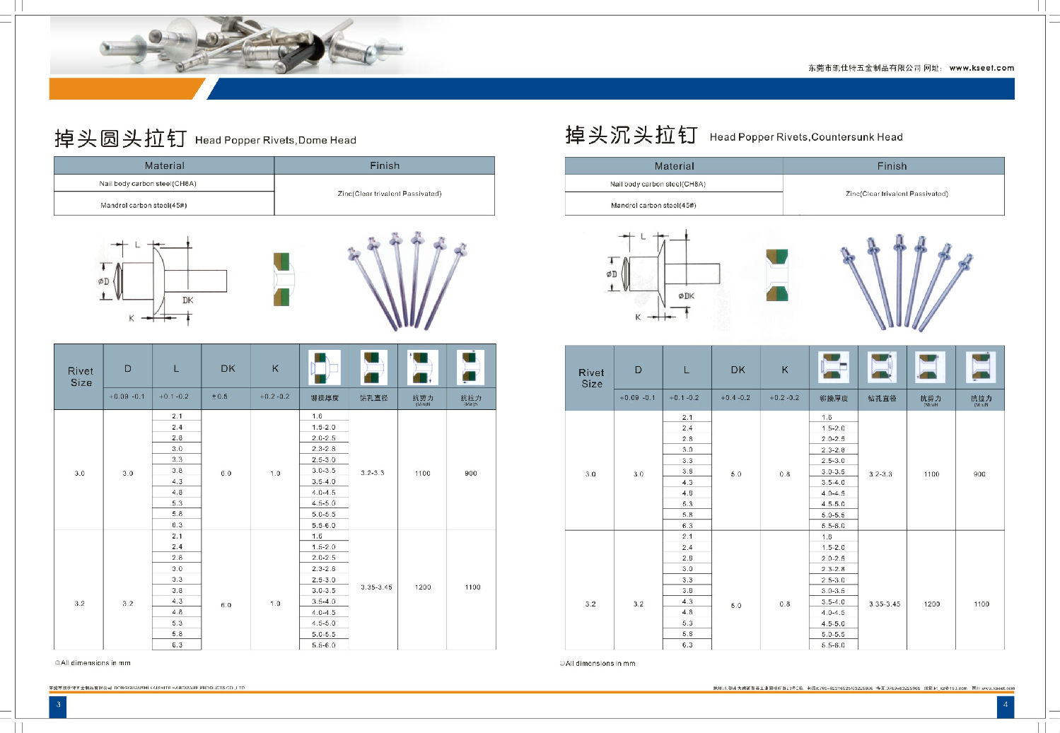 SKK3065PT的铆钉长度是6.3mm,主要拉铆5.5mm至6.0mm之间的钣金,两边沙拉孔!拉钉拉铆完后通过头部的喇叭口使产品底部翻边,起到紧固作用!抗拉强度700N以上,抗剪强度都有800N以上